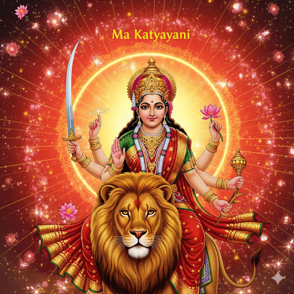 Katyayani is a fierce form who defeated Mahishasura. She rides a lion and holds weapons in her hands.