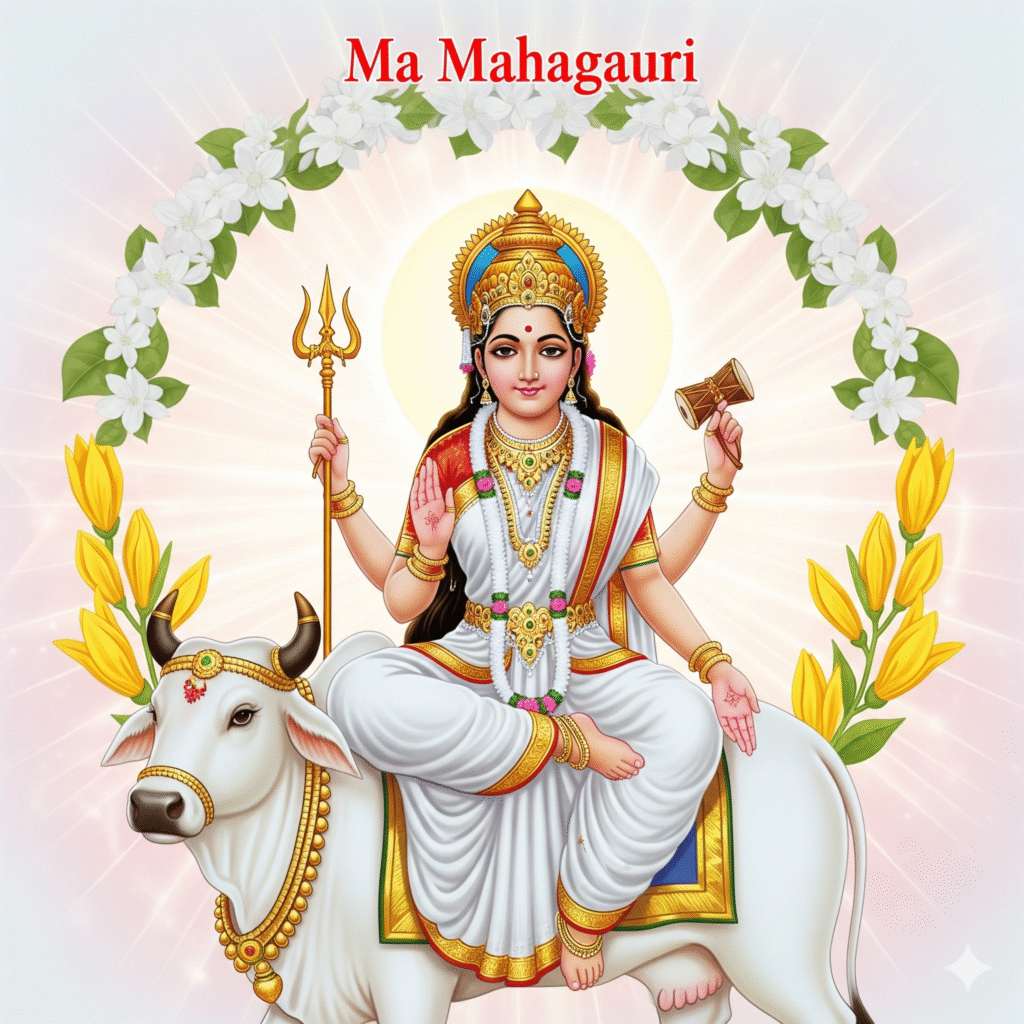 Mahagauri represents purity and serenity. After penance, her body glowed white like the moon.