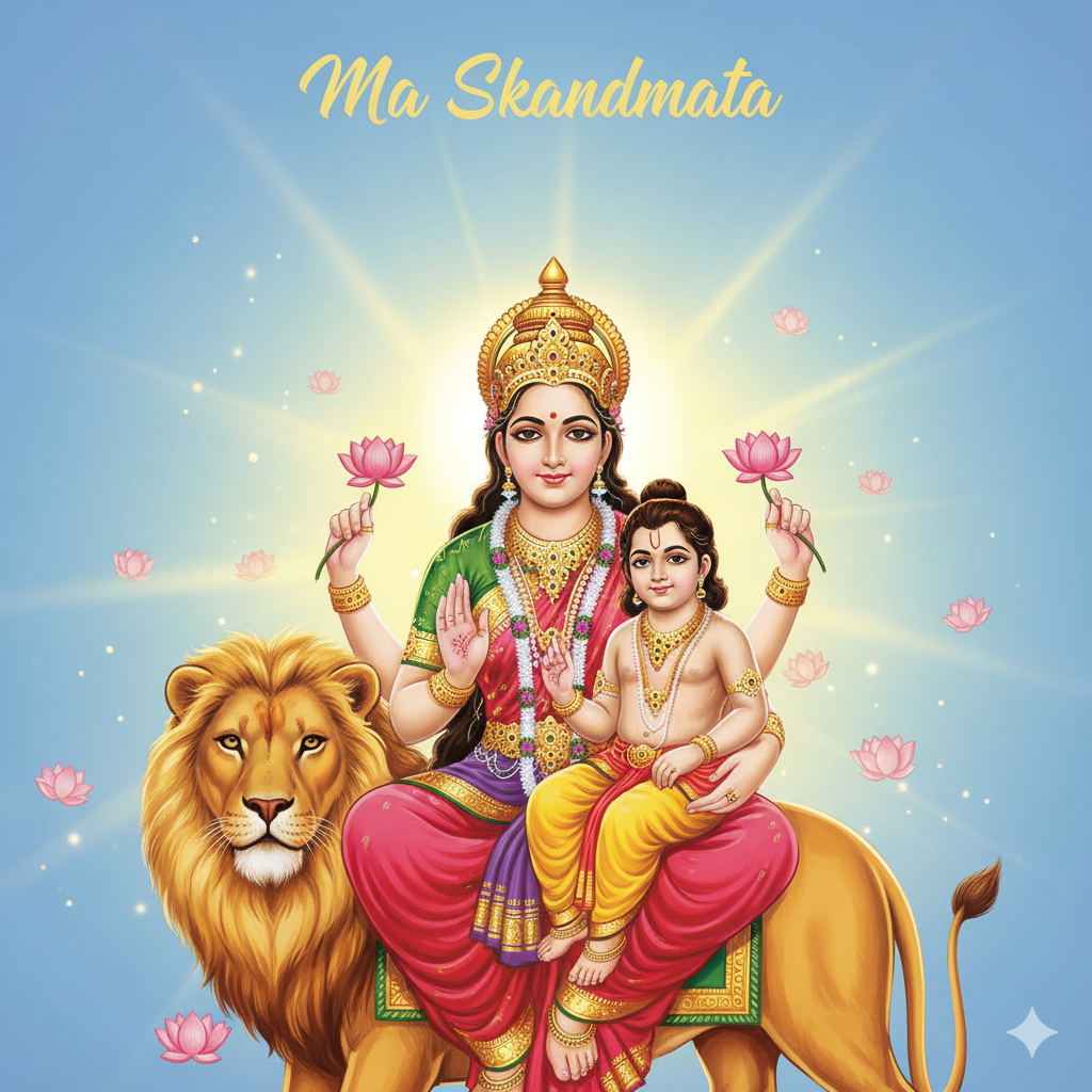 Skandmata is the mother of Lord Kartikeya. She is depicted seated on a lotus holding her child.