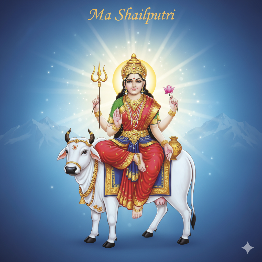 Shailputri is the daughter of the Himalayas. She represents strength and stability. On her first day, she is worshipped riding a bull, holding a trident and lotus.