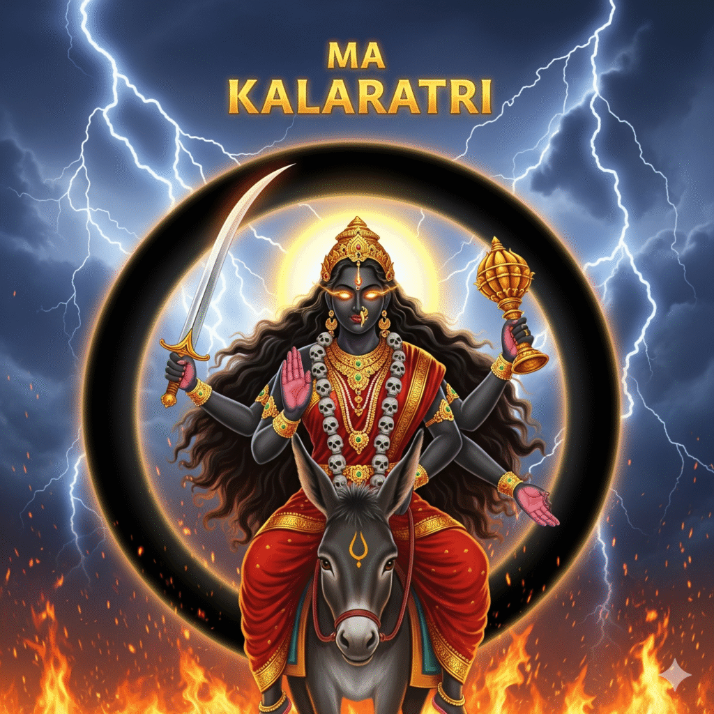 Kaalratri is the most fearsome form, dark in appearance but powerful in protecting devotees.